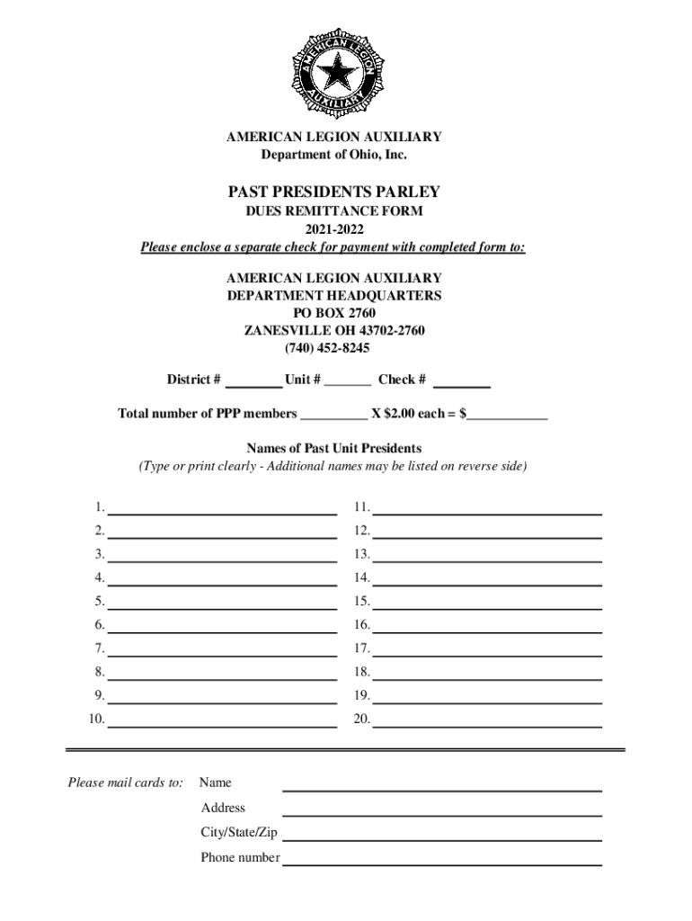 AMERICAN LEGION AUXILIARY Department of Ohio, Inc. PAST PRESIDENTS PARLEY DUES REMITTANCE FORM 20212022 Please enclose a separate check for payment with completed form to: AMERICAN LEGION AUXILIARY