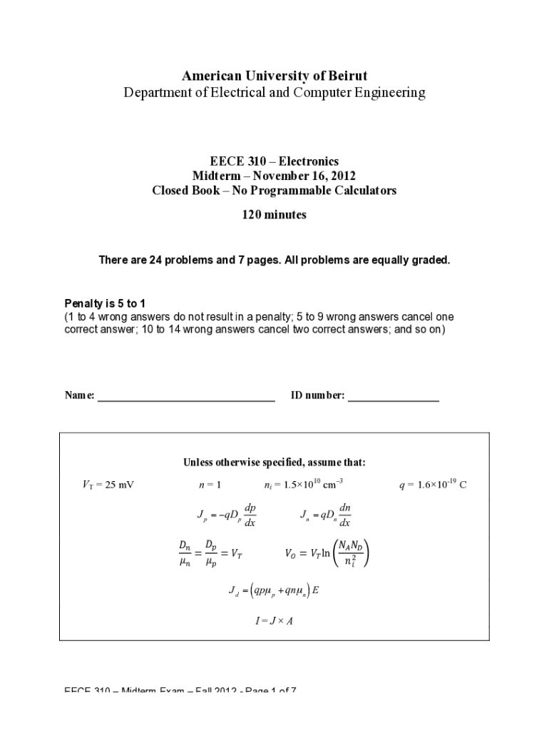 American University of Beirut Department of Electrical and Computer EngineeringEECE 310 Electronics Midterm November 16, 2012, Closed Book No Programmable Calculators 120 minutes There are 24 problems