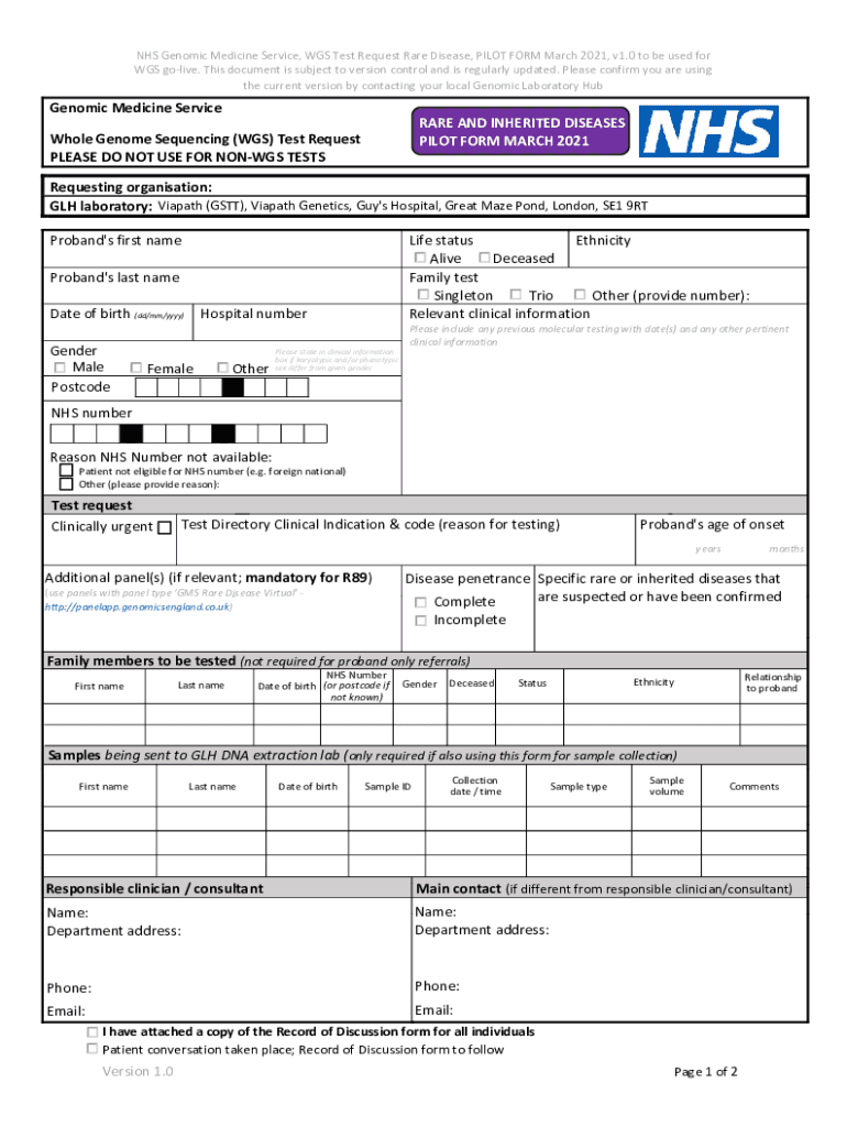 NHS Genomic Medicine Service, WGS Test Request Rare Disease, PILOT FORM March 2021, v1.0 to be used for WGS olive. This document is subject to version control and is regularly updated. Please confirm