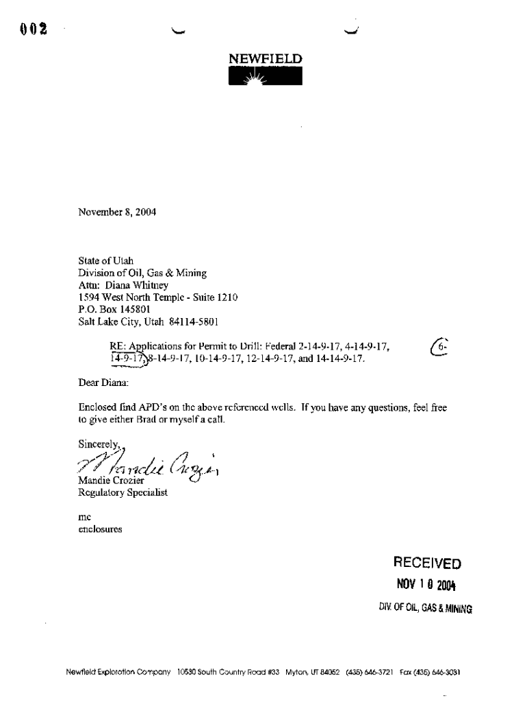 NEWFIELDNovember 8, 2004State of Utah Division of Oil, Gas & Mining Attn: Diana Whitney 1594 West North Temple Suite 1210 P.O. Box 145801 Salt Lake City, Utah 841145801 RE: 1491lications for Permit
