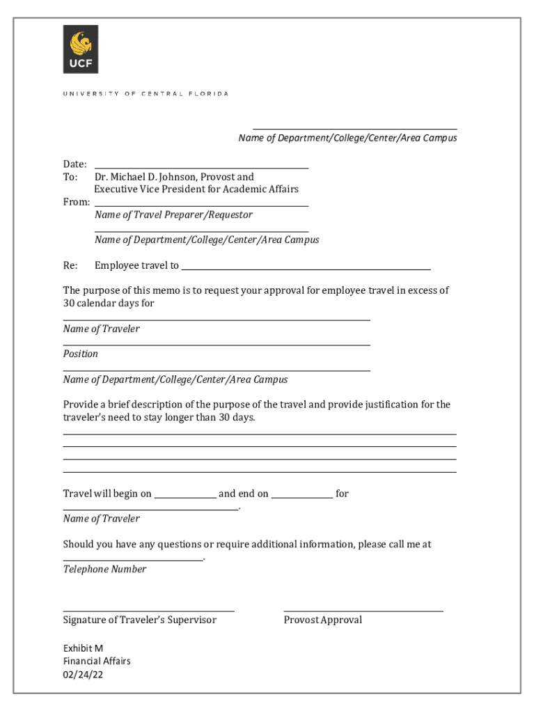 ___ Name of Department/College/Center/Area Campus Date: ___ To: Dr. Michael D. Johnson, Provost and Executive Vice President for Academic Affairs From: ___ Name of Travel Preparer/Requestor ___ Name