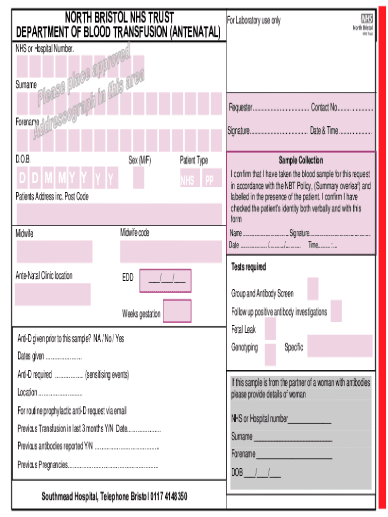 NORTH BRISTOL NHS TRUST DEPARTMENT OF BLOOD TRANSFUSION (ANTENATAL)For Laboratory use only NHS or Hospital Number. Surname Requester ...................................... Contact No ........................