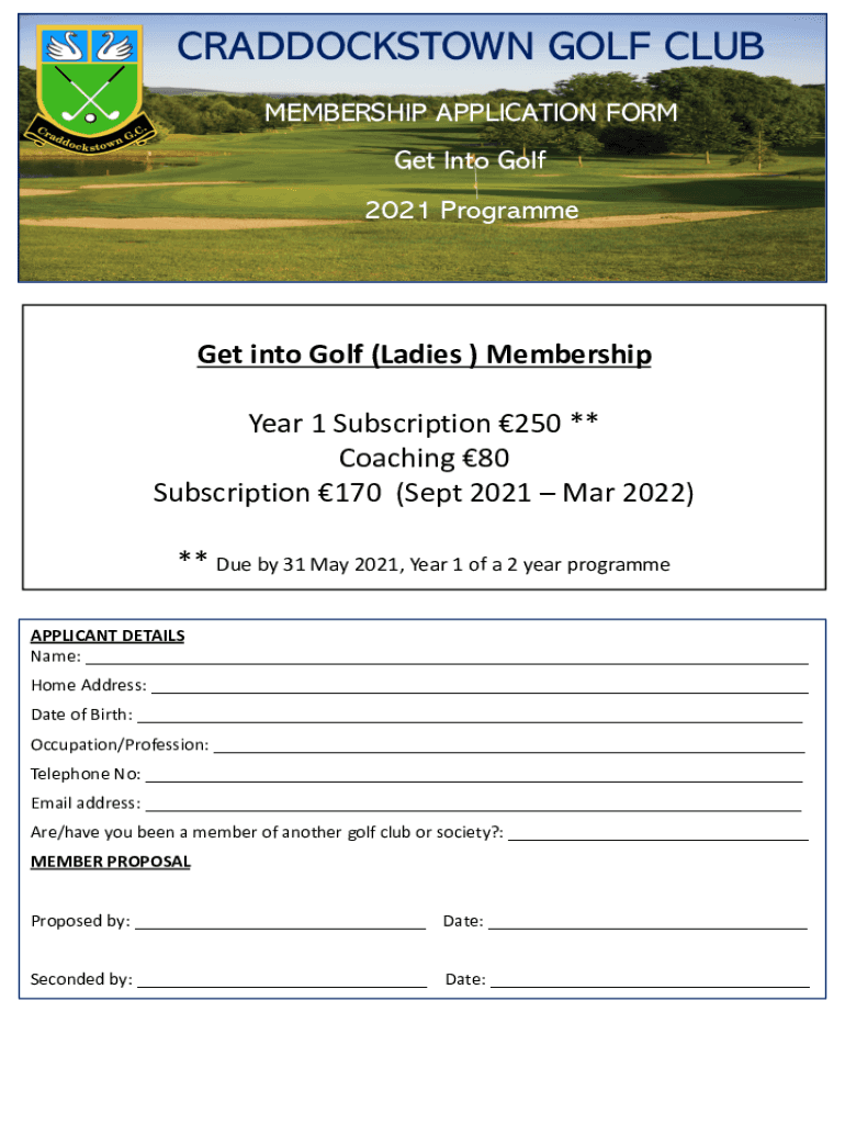 CRADDOCKSTOWN GOLF CLUB MEMBERSHIP APPLICATION FORM Get Into Golf 2021 Programmed into Golf (Ladies) Membership Year 1 Subscription 250 ** Coaching 80 Subscription 170 (Sept 2021 Mar 2022) ** Due