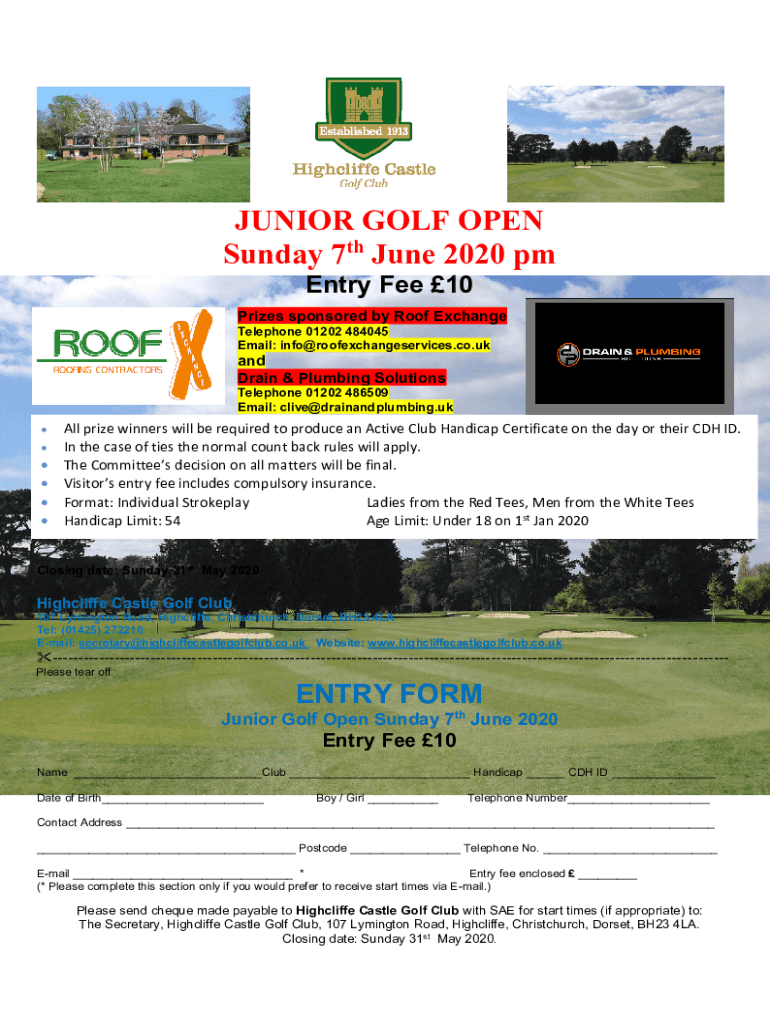 JUNIOR GOLF OPEN Sunday 7th June 2020 pm Entry Fee 10 Prizes sponsored by Roof Exchange Telephone 01202 484045 Email: info@roofexchangeservices.co.ukand Drain & Plumbing Solutions Telephone 01202