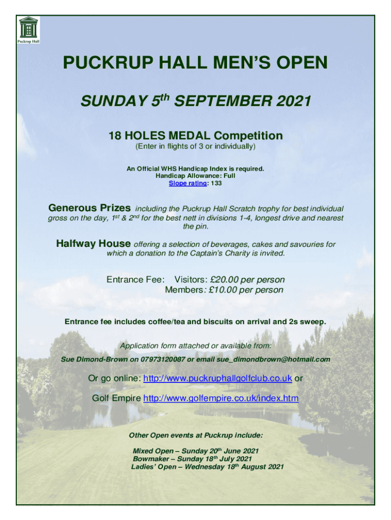 PUCK RUP HALL MEN OPEN SUNDAY 5th SEPTEMBER 2021 18 HOLES MEDAL Competition (Enter in flights of 3 or individually) An Official WHS Handicap Index is required. Handicap Allowance: Full Slope rating:
