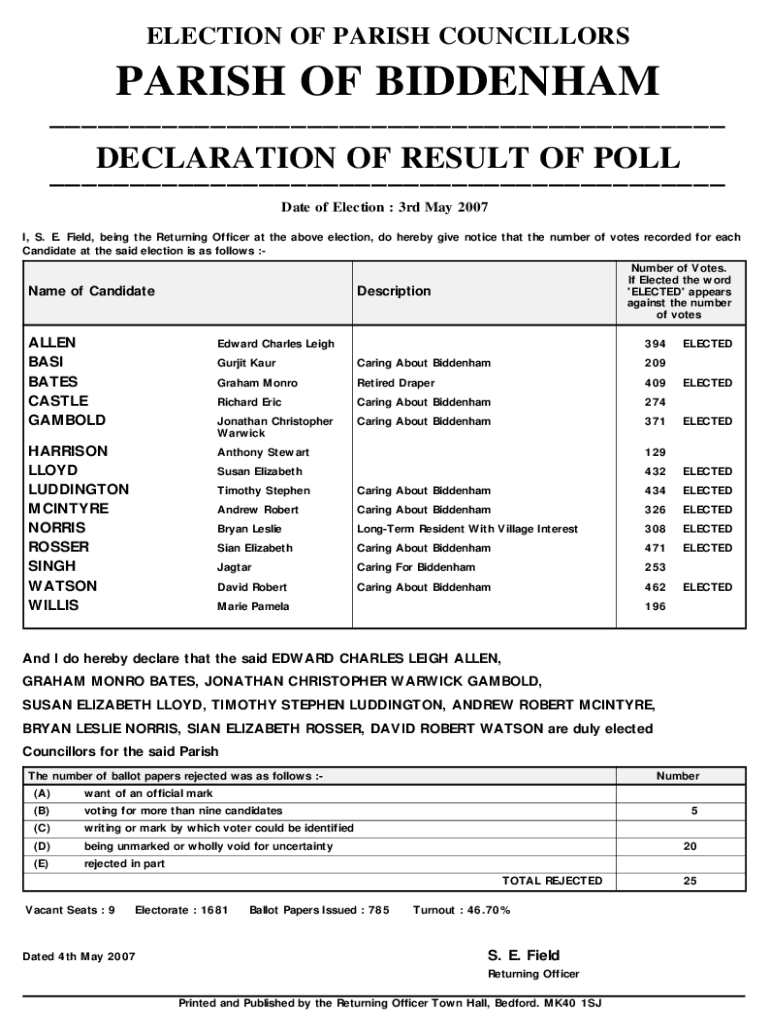 ELECTION OF PARISH COUNCILLORSPARISH OF BIDDEN___ DECLARATION OF RESULT OF POLL ___ Date of Election : 3rd May 2007 I, S. E. Field, being the Returning Officer at the above election, do hereby give