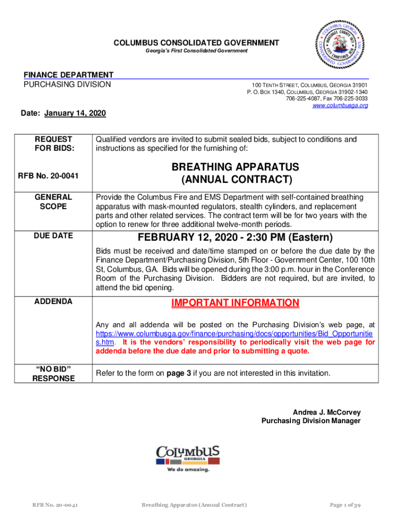 COLUMBUS CONSOLIDATED GOVERNMENT Georgia's First Consolidated GovernmentFINANCE DEPARTMENT PURCHASING DIVISION100 TENTH STREET, COLUMBUS, GEORGIA 31901 P. O. BOX 1340, COLUMBUS, GEORGIA 319021340