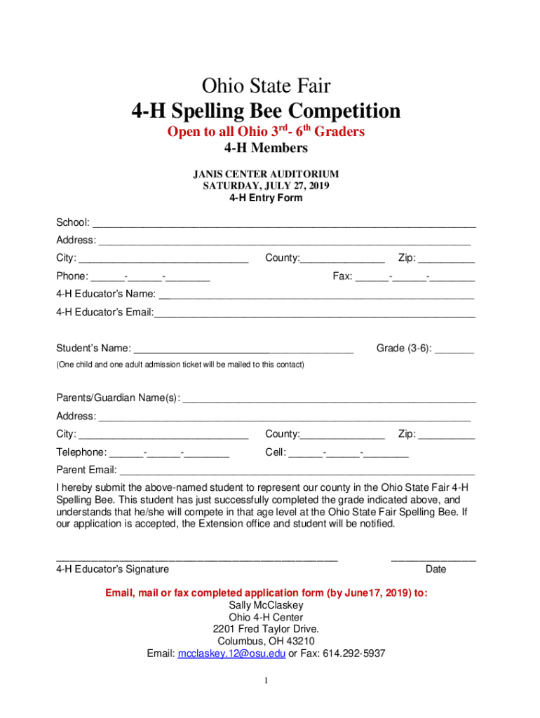 Ohio State Fair 4H Spelling Bee Competition Open to all Ohio 3rd 6th Graders 4H Members JANIS CENTER AUDITORIUM SATURDAY, JULY 27, 2019 4H Entry Form School: ___ Address: ___ City: ___County:___Phone: