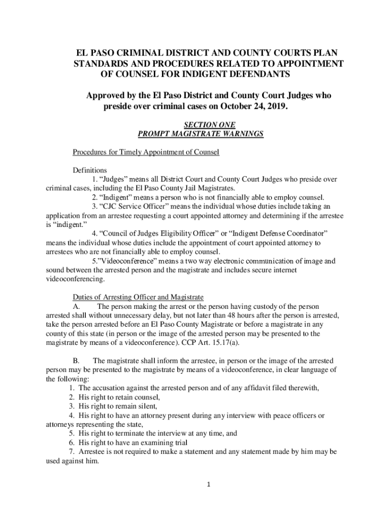EL PASO CRIMINAL DISTRICT AND COUNTY COURTS PLAN STANDARDS AND PROCEDURES RELATED TO APPOINTMENT OF COUNSEL FOR INDIGENT DEFENDANTS Approved by the El Paso District and County Court Judges who preside