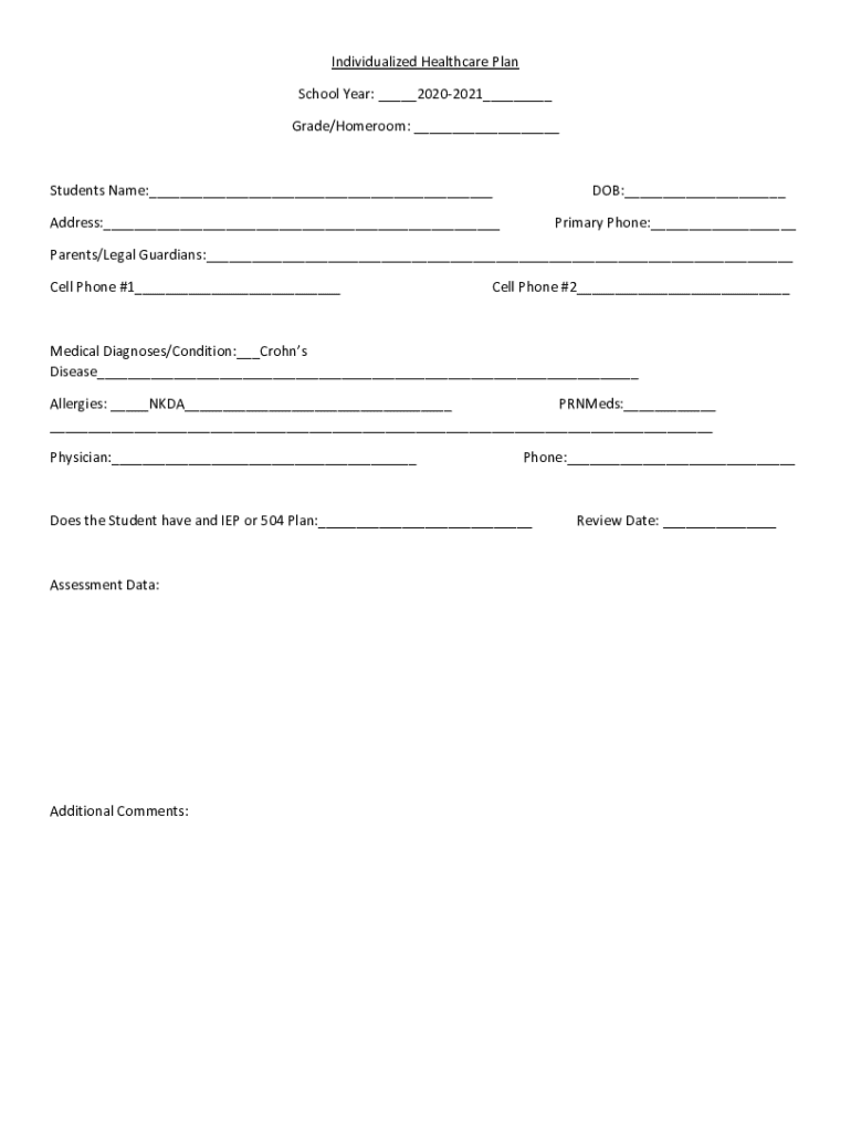 Individualized Healthcare Plan School Year: ___20202021___ Grade/Homeroom: ___Students Name:___DOB:___Address:___Primary Phone:___Parents/Legal Guardians:___ Cell Phone #1___Cell Phone #2___Medical