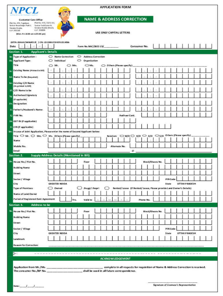 APPLICATION FORENAME & ADDRESS CORRECTIONCustomer Care Office Plot No. ESS, 33/11 KV, Sector TechZoneIV, Greater Noida (West), U.P. 201009Plot No. ESS, Tuvalu, Sector Knowledge Park, Greater Noida,