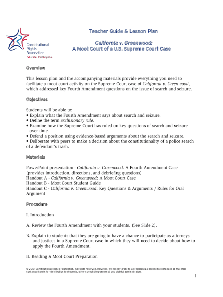 Teacher Guide & Lesson Plan California v. Greenwood: A Moot Court of a U.S. Supreme Court CaseOverview This lesson plan and the accompanying materials provide everything you need to facilitate a moot