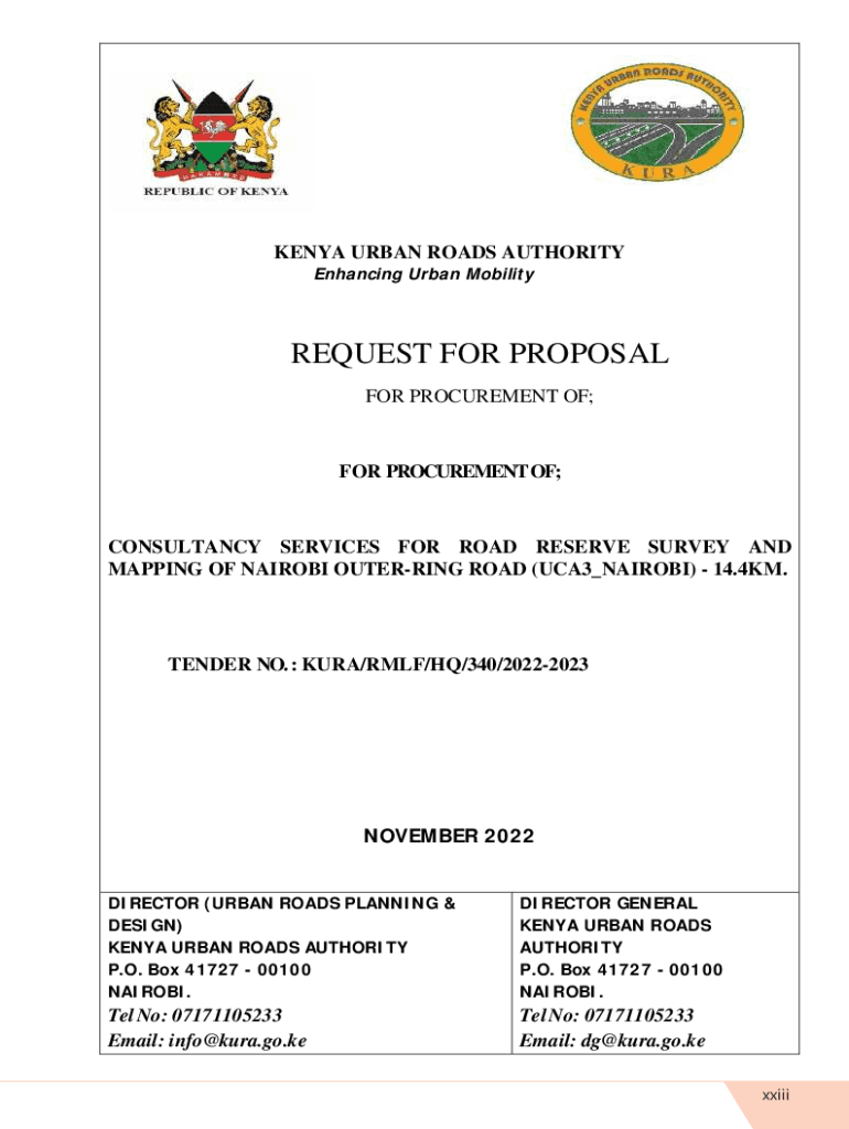 KENYA URBAN ROADS AUTHORITY Enhancing Urban MobilityREQUEST FOR PROPOSAL FOR PROCUREMENT OF;FOR PROCUREMENT;CONSULTANCY SERVICES FOR ROAD RESERVE SURVEY AND MAPPING OF NAIROBI DETERRING ROAD (UCA3_NAIROBI)