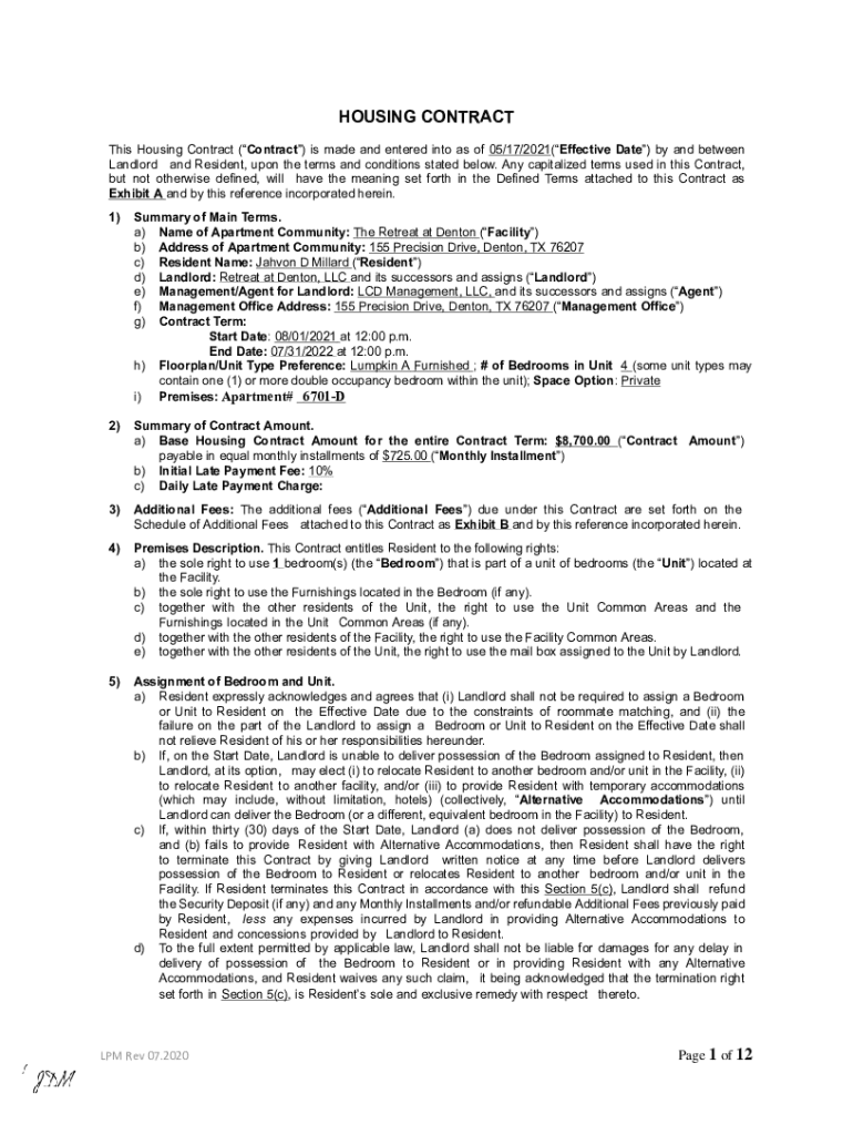 HOUSING CONTRACT This Housing Contract (Contract) is made and entered into as of 05/17/2021(Effective Date) by and between Landlord and Resident, upon the terms and conditions stated below. Any capitalized