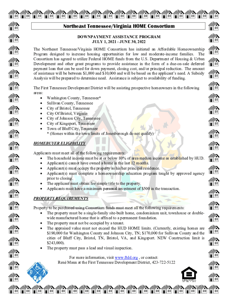 Northeast Tennessee/Virginia HOME Consortium Down payment ASSISTANCE PROGRAM JULY 1, 2021, JUNE 30, 2023, The Northeast Tennessee/Virginia HOME Consortium has initiated an Affordable Homeownership