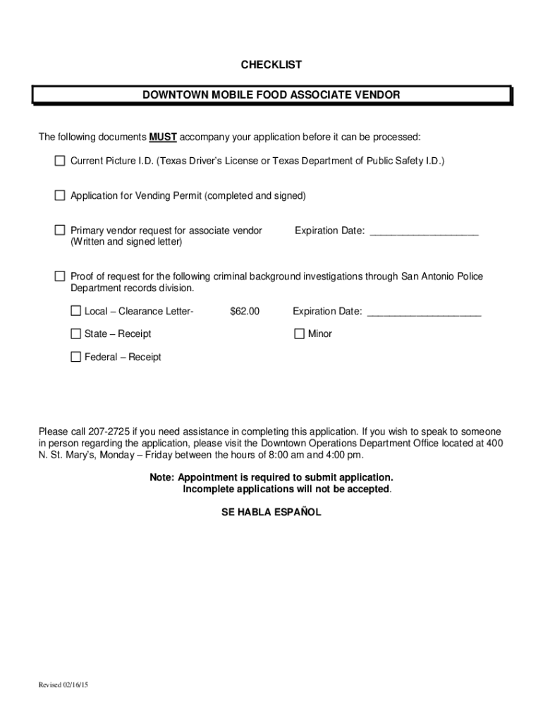 CHECKLIST DOWNTOWN MOBILE FOOD ASSOCIATE Vendor following documents MUST accompany your application before it can be processed: Current Picture I.D. (Texas Driver's License or Texas Department of