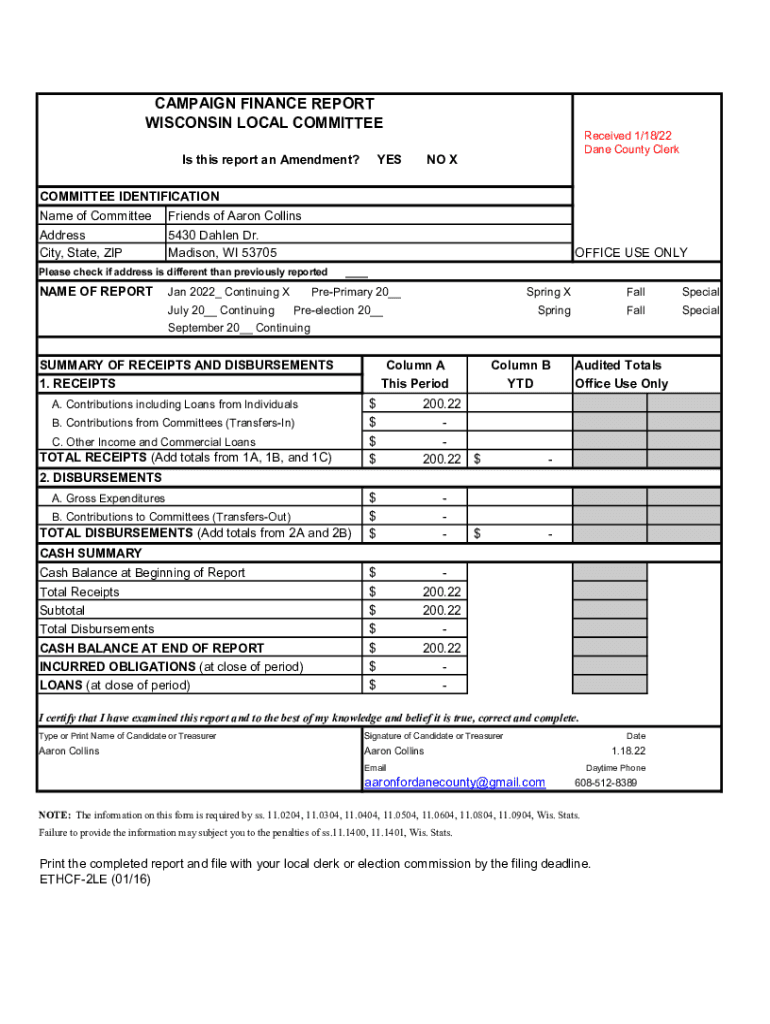 CAMPAIGN FINANCE REPORT WISCONSIN LOCAL COMMITTEE Is this report an Amendment? Received 1/18/22 Dane County Clerk NO COMMITTEE IDENTIFICATION Name of Committee Address City, State, ZIP Friends of