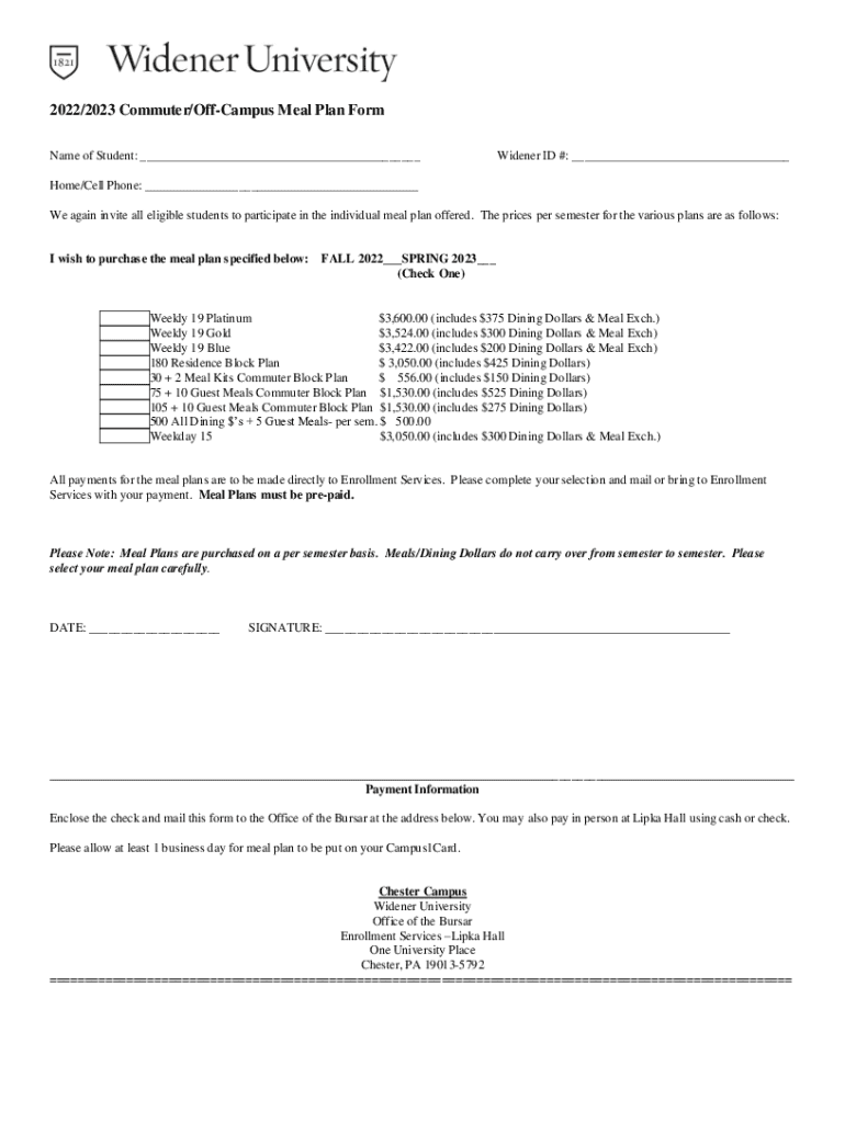 2022/2023 Commuter/Campus Meal Plan Form Name of Student: ___Widener ID #: ___Home/Cell Phone: ___ We again invite all eligible students to participate in the individual meal plan offered. The prices