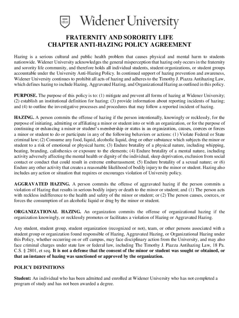 FRATERNITY AND SORORITY LIFE CHAPTER ACTIVATING POLICY AGREEMENT Hazing is a serious cultural and public health problem that causes physical and mental harm to students nationwide. Widener University