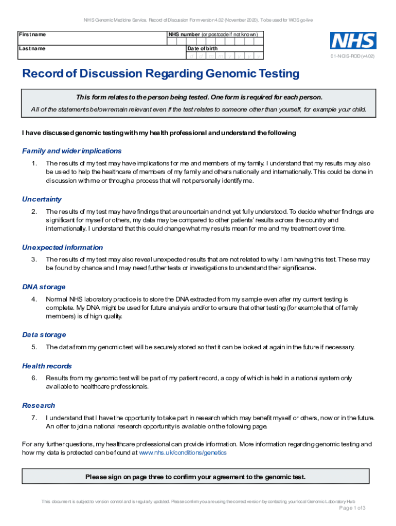 NHS Genomic Medicine Service. Record of Discussion Form version 4.02 (November 2020). To be used for WGS goliveFirst name NHS number (or postcode if not known)Last namesake of birthed m yyyy01NGISROD