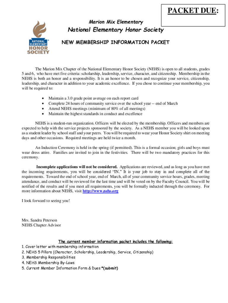 PACKET DUE: Marion Mix ElementaryNational Elementary Honor Society NEW MEMBERSHIP INFORMATION Packetize Marion Mix Chapter of the National Elementary Honor Society (NEWS) is open to all students,