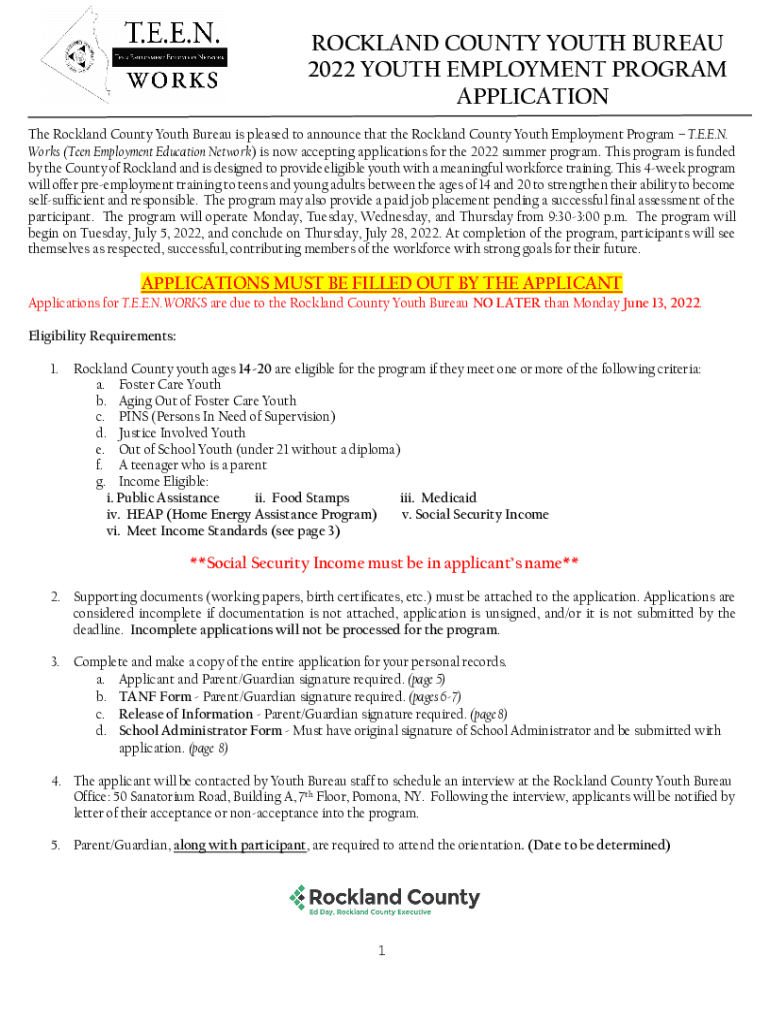 ROCKLAND COUNTY YOUTH BUREAU 2022 YOUTH EMPLOYMENT PROGRAM APPLICATION The Rockland County Youth Bureau is pleased to announce that the Rockland County Youth Employment Program T.E.E.N. Works (Teen