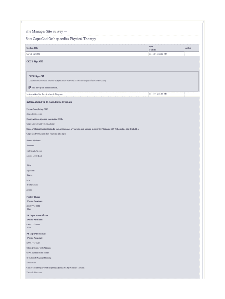 Site Manager Site Survey Site: Cape Cod Orthopedics Physical Therapy Section Titles UpdateCCCE Sign Off11/12/15 12:05 PMC CCE Sign Office Signs Off: Click the box below to indicate that you have reviewed