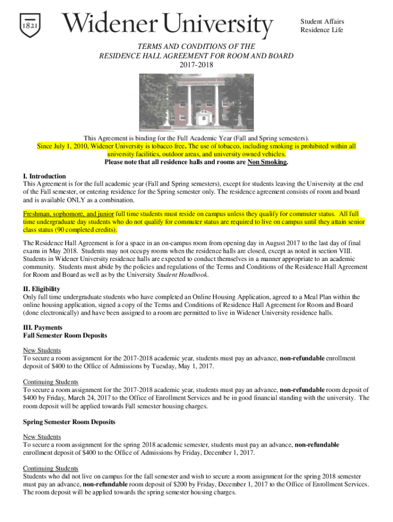 Student Affairs Residence Lifeforms AND CONDITIONS OF THE RESIDENCE HALL AGREEMENT FOR ROOM AND BOARD 20172018This Agreement is binding for the Full Academic Year (Fall and Spring semesters). Since