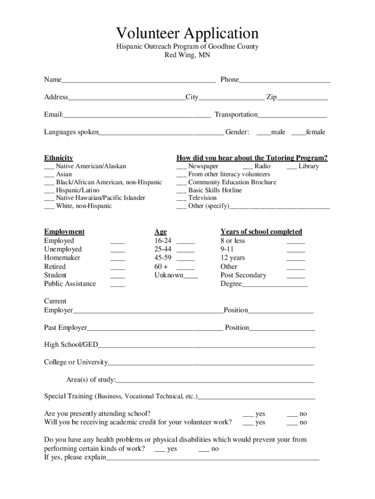 Volunteer Application Hispanic Outreach Program of Good hue County Red Wing, MN Name___ Phone___ Address___City___ Zip___ Email:___ Transportation___ Languages spoken___ Gender:___male ___femaleEthnicityHow