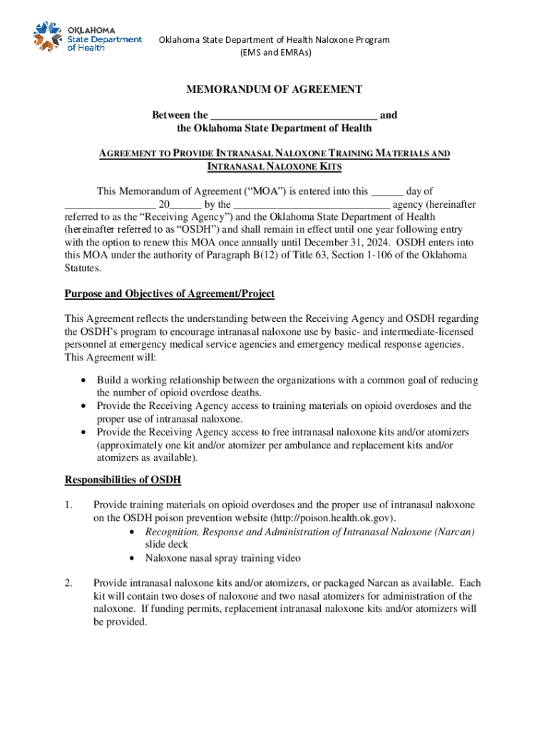 Oklahoma State Department of Health Naloxone Program (EMS and Eras)MEMORANDUM OF AGREEMENT Between the ___ and the Oklahoma State Department of Health AGREEMENT TO PROVIDE INTRANASAL NALOXONE TRAINING