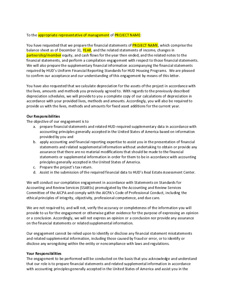 To the appropriate representative of management of PROJECT NAME: You have requested that we prepare the financial statements of PROJECT NAME, which comprise the balance sheet as of December 31, YEAR,