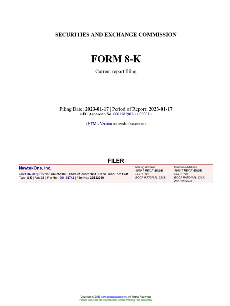 Get the free NewtekOne, Inc. Form 8-K Current Event Report Filed 2023-01-17. Accession Number