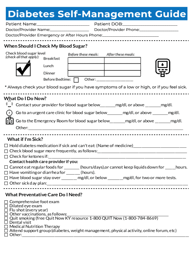 Diabetes Self-management GuidePatient Name:___ Patient DOB:___Doctor/Provider Name:___ Doctor/Provider Phone:___ Doctor/Provider Emergency or After Hours Phone:___When Should I Check My Blood Sugar?