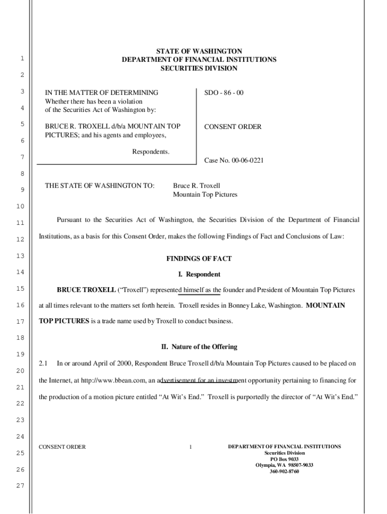 Get the free Bruce R Troxell-Consent Order. Bruce R Troxell-Consent Order - dfi wa