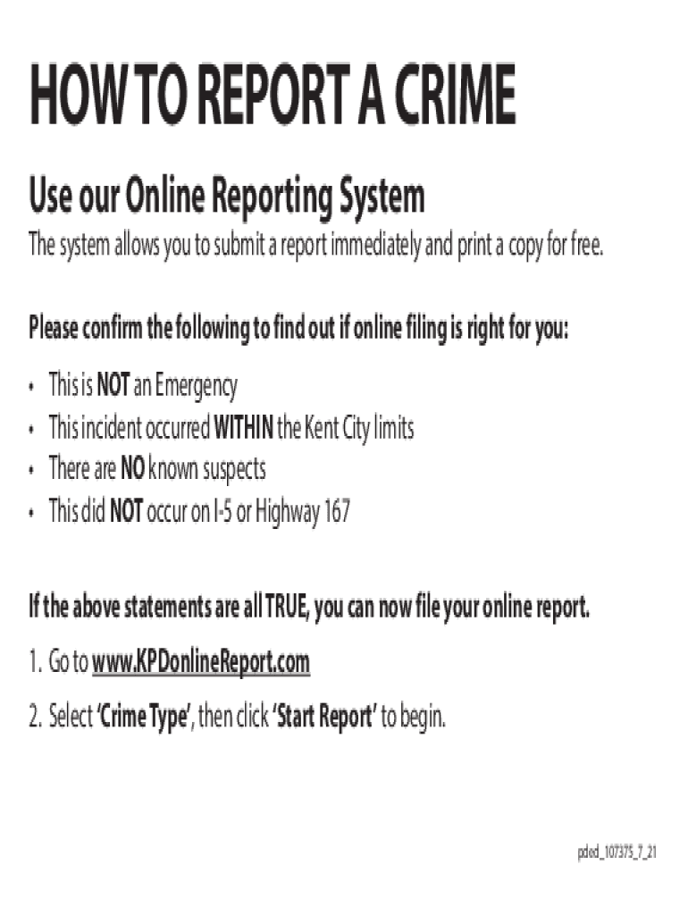 HOW TO REPORT A CRIME Use our Online Reporting Systemize system allows you to submit a report immediately and print a copy for free. Please confirm the following to find out if online filing is right