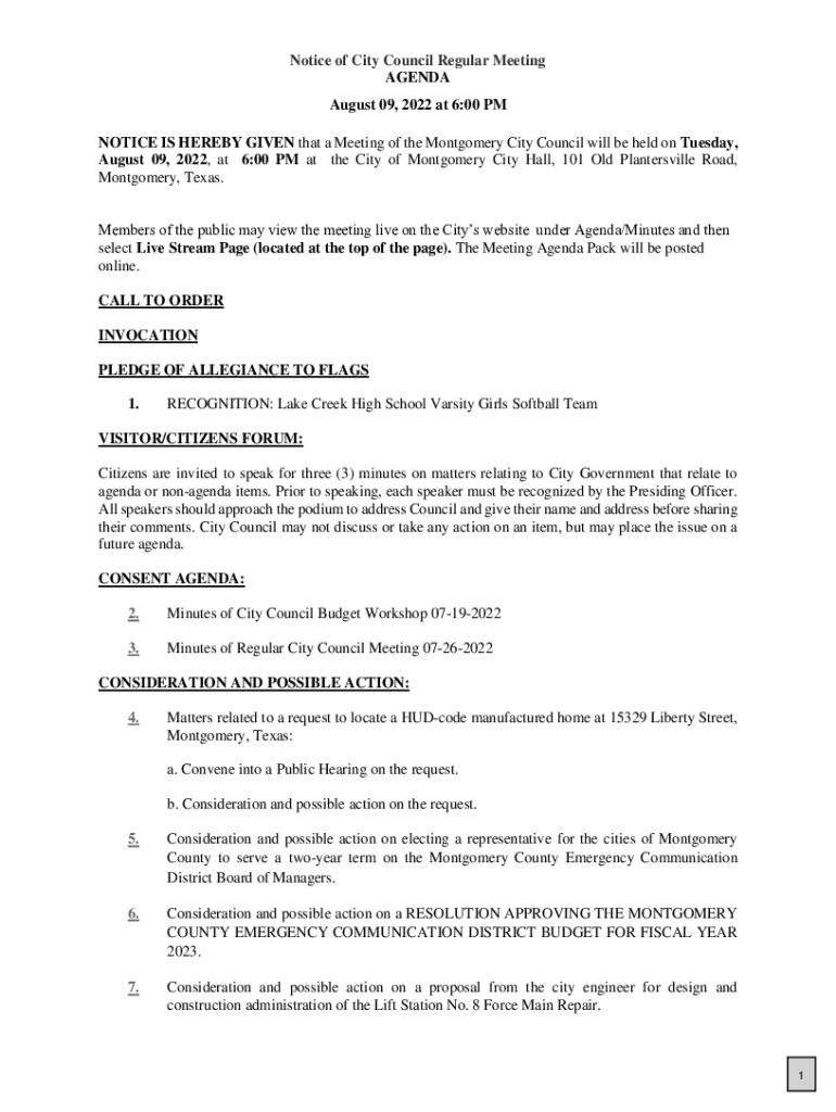 Notice of City Council Regular Meeting AGENDA August 09, 2022, at 6:00 PM NOTICE IS HEREBY GIVEN that a Meeting of the Montgomery City Council will be held on Tuesday, August 09, 2022, at 6:00 PM