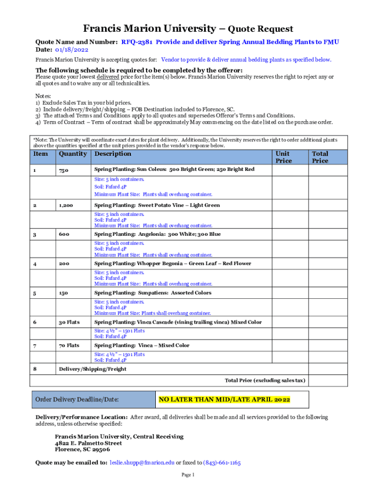 Francis Marion University Quote Request Quote Name and Number: RFQ2381 Provide and deliver Spring Annual Bedding Plants to FM Date: 01/18/2023 Francis Marion University is accepting quotes for: Vendor