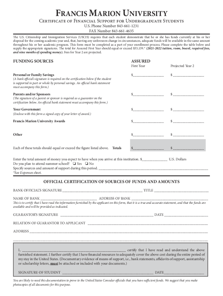 FRANCIS MARION UNIVERSITY Certificate of Financial Support for Undergraduate Students U.S. Phone Number 8436611231 FAX Number 8436614635 The U.S. Citizenship and Immigration Services (USCIS) requires