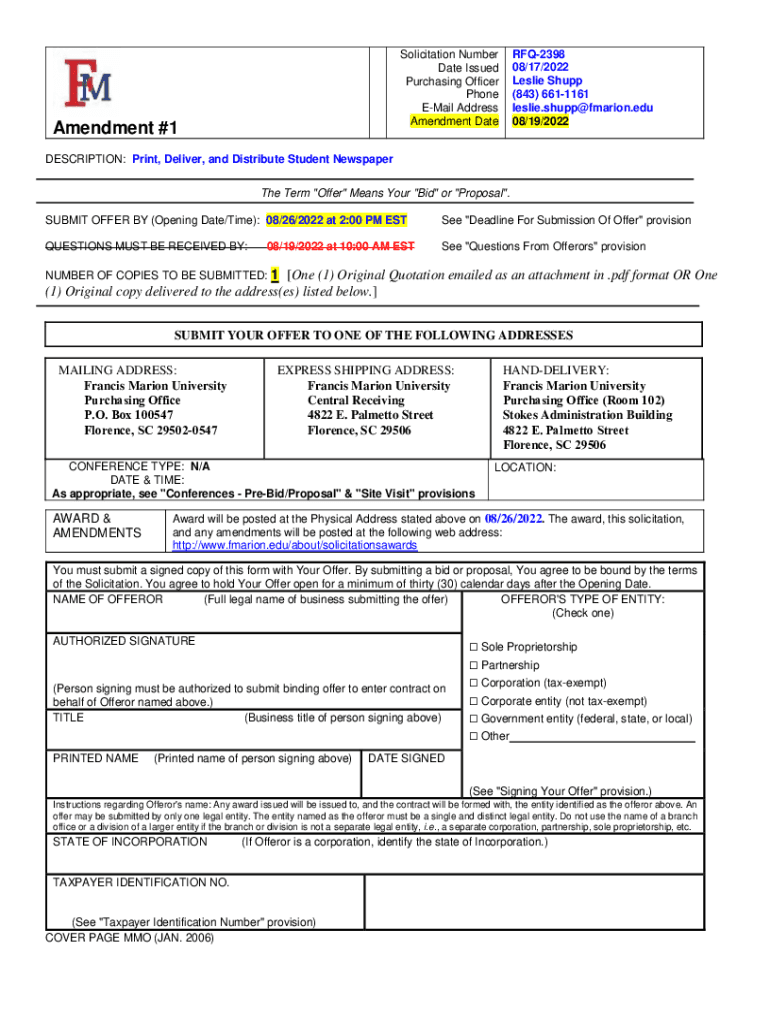 Fill out your rfq-2398-amendment-1pdf - francis marion online with pdfFiller!