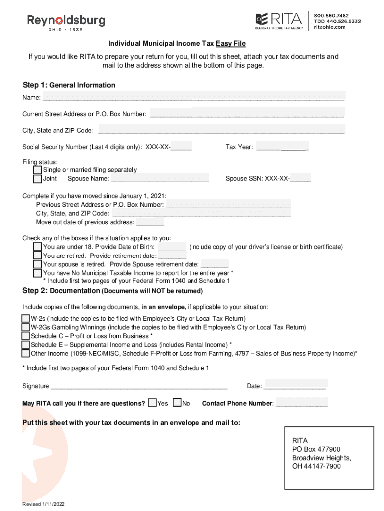 RESET FORMPRINTIndividual Municipal Income Tax Easy File If you would like RITA to prepare your return for you, fill out this sheet, attach your tax documents and mail to the address shown at the