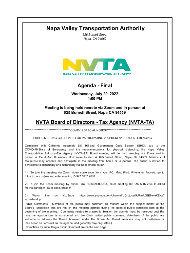 Napa Valley Transportation Authority 625 Burn ell Street Napa, CA 94559Agenda Final Wednesday, July 20, 2022 1:00 PM Meeting is being held remote via Zoom and in person at 625 Burn ell Street, Napa