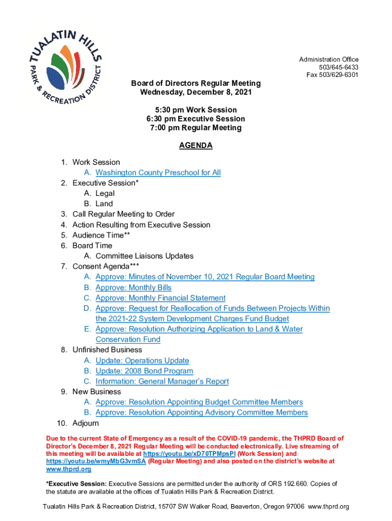 Board of Directors Regular Meeting Wednesday, December 8, 2021Administration Office 503/6456433 Fax 503/62963015:30 pm Work Session 6:30 pm Executive Session 7:00 pm Regular Meeting AGENDA 1. Work