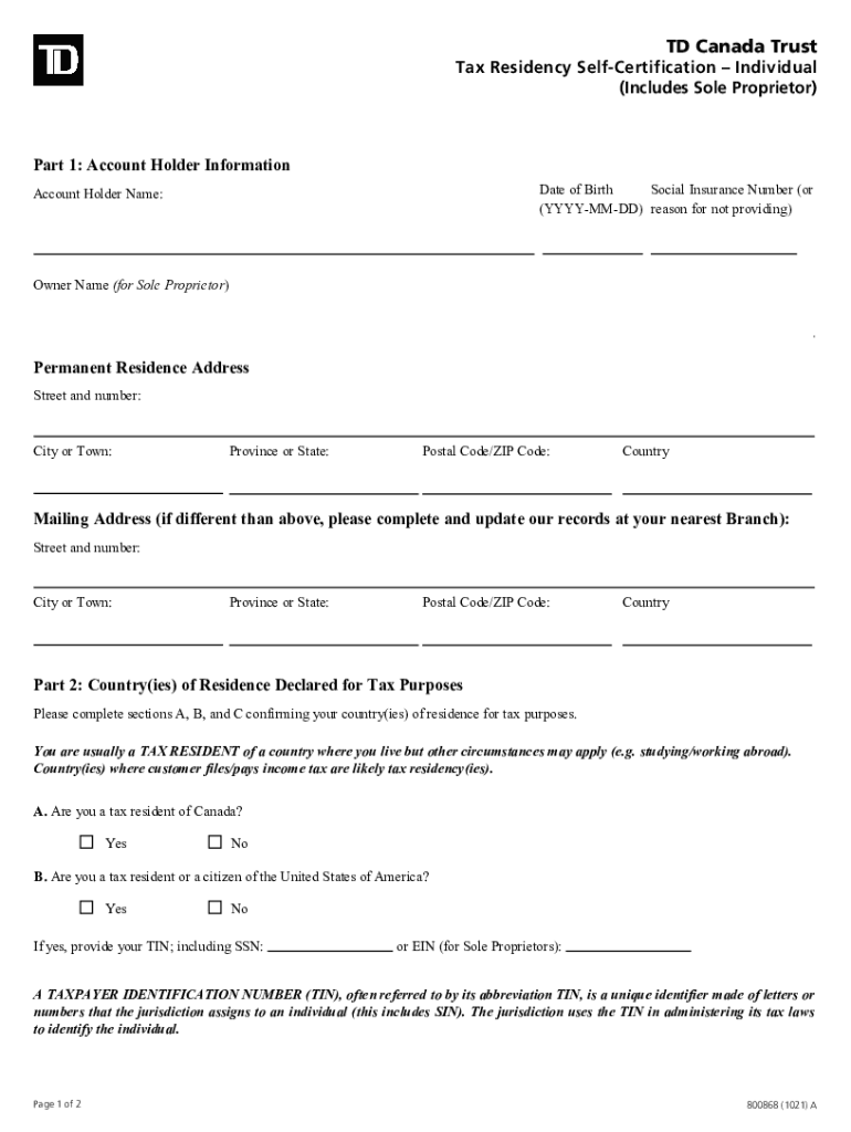 TD Canada Trustier Format Residency Recertification Individual (Includes Sole Proprietor)Part 1: Account Holder Information Social Insurance Number (or Date of Birth (YYYYMMDD) reason for not providing)Account