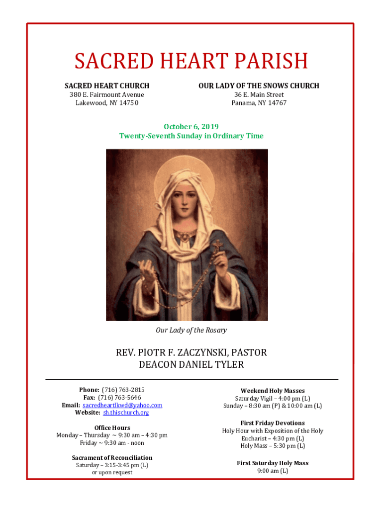 SACRED HEART PARISH LADY OF THE SNOWS CHURCHYARD HEART CHURCH380 E. Fairmount Avenue Lakewood, NY 1475036 E. Main Street Panama, NY 14767October 6, 2019TwentySeventh Sunday in Ordinary Timeout Lady of the Rosary