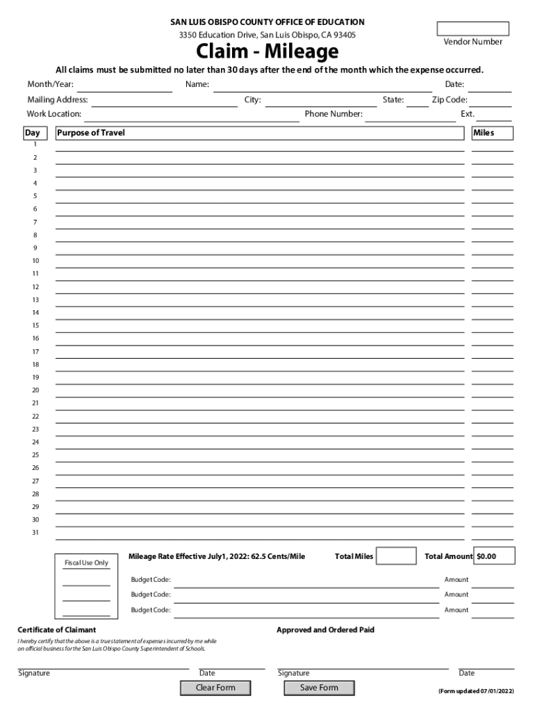 SAN LUIS OBISPO COUNTY OFFICE OF EDUCATION 3350 Education Drive, San Luis Obispo, CA 93405Vendor NumberClaim Mileage claims must be submitted no later than 30 days after the end of the month which