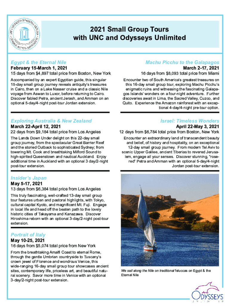 2021 Small Group Tours with UNC and Odysseys Unlimited Egypt & the Eternal Nile February 15March 1, 202115 days from $4,897 total price from Boston, New York Accompanied by an expert Egyptian guide,