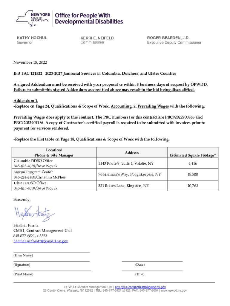 KATHY HOC HUL GovernorROGER BEARDED, J.D. Executive Deputy CommissionerKERRI E. NEUFELD Commissioner November 18, 2022, IF TAC 121522 20232027 Janitorial Services in Columbia, Duchess, and Ulster