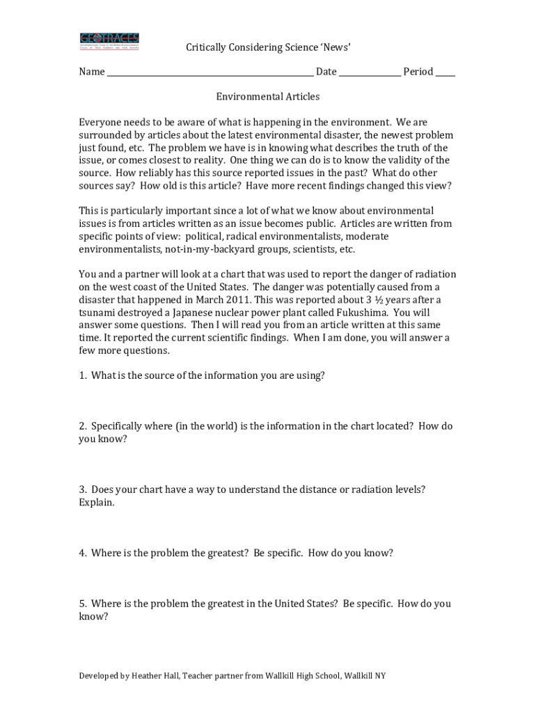 Critically Considering Science Newsome ___ Date ___ Period ___Environmental ArticlesEveryone needs to be aware of what is happening in the environment. We are surrounded by articles about the latest