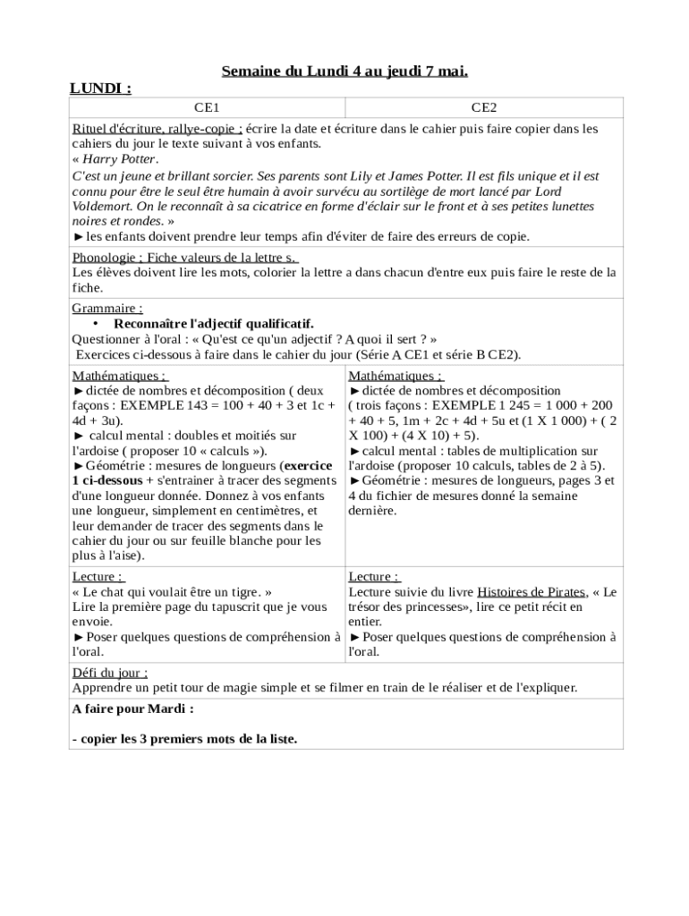 Remained Du Lundy 4 au Jedi 7 Mai. LUNDY : CE1CE2Rituel d\'culture, rallyecopie : crime la date ET culture days LE cashier pews free copier days LES cashiers du jour LE text servant Los infants. Harry