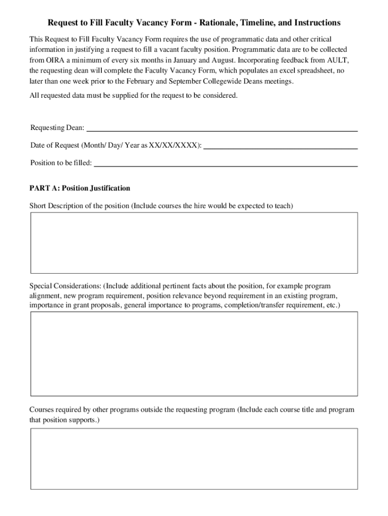Request to Fill Faculty Vacancy Form Rationale, Timeline, and Instructions This Request to Fill Faculty Vacancy Form requires the use of programmatic data and other critical information in justifying
